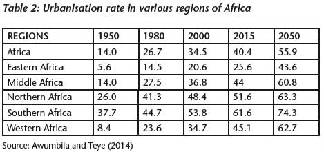 Africa is the least urbanised continent in the world. In 2010 it was estimated that only about 36 per cent of the continent was 'urban'.29The continent, however, is in overdrive to urbanise at the rate of 3,5 per cent per year over the last two decades, which is expected to continue up to 2050.30 Table 2 provides the trajectory of population growth on the African continent since 1950. By 2015, 40,4 per cent of the population was living in urban areas.31 It is projected that by 2050, 55,9 per cent of the population will be living in urban areas. In 2015, Southern Africa had the largest population in urban areas with 61,6 per cent.32