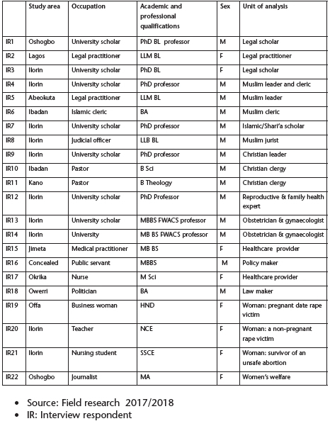 The 22 participants interviewed for this study were chosen from five main groups. The first group consists of medical doctors, academics, and other healthcare providers: two professors that are also senior consultant gynaecologists and obstetricians (IRs 13-14) and a professor of reproductive and family health (IR12). These were selected as they engage with rape victims and women with unwanted pregnancies. Most of them were selected also because they have qualifications that could draw those in need of abortion services to them. The second group consists of lawyers: legal scholars that have carried out extensive research on the focus of the present study (IRs 1, 3 and 7); a private legal practitioner (IR2); and a Muslim Shari'a jurist (IR8). The third group consists of a policy and law maker: a public servant in the health sector (IR16) and a lawmaker (IR18). They were chosen because of their impact on law and policy making. The fourth group comprises religious clerics or leaders of the Islamic faith (IRs 4-6) and of the Christian faith (IRs 9-11). These were selected, considering the religious perspectives on the focus of this study, and influence of religion on public sentiments on the issues in Nigeria. The fifth group comprises women who are believed to have been or suspected of having been victims of rape or had cause to seek or undergo abortion (IRs 19-21). Their inclusion in the study is indispensable as the study concerns them.