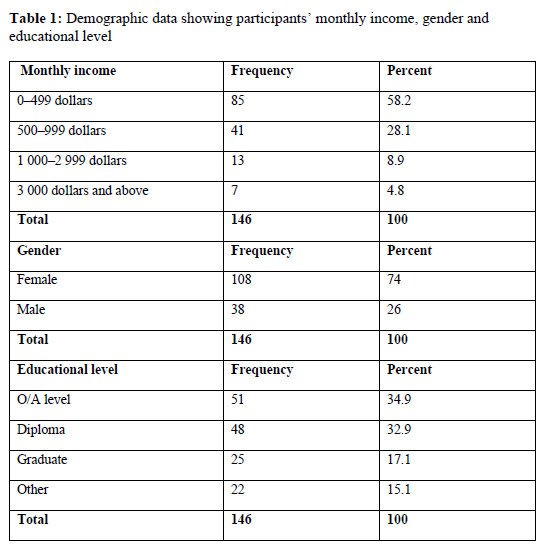Table 1 shows that 74% of the participants were female and 26% were male. The income of 58.2% of the participants was in the low-income range (0-499 dollars) and only 4.8% were in the high-income range (3 000 dollars and above). The table also depicts that 34.9% had an O-level or A-level education, 32.9% had a diploma level, 17.1% a graduate level and 15.1 % had other qualifications.