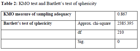 Bartlett's test of sphericity for testing the adequacy of the correlation matrix was significant at p < 0.001 and this was an indication that the correlation matrix had significant correlations among some of the factors. Bartlett's test of sphericity had a chi-square (%2) df = 210, 2385.395 and the obtained degree of significance had a p-value < 0.001.