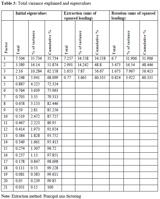 The number of the initial unrotated factors to be extracted is determined by the KMO test and the Scree test or plot. The eigenvalues associated with each factor are depicted in Table 3 and the variance explained by those factors is also shown. Values below 0.4 were suppressed in the analysis. The extraction method utilised in the study was principal axis factoring and 21 linear components were identified before extraction. The four factors extracted accounted for a 60.335% variance. The first factor explained 31.906% of the total variance with an eigenvalue of 6.7. The second factor explained a 16.54% variance with an eigenvalue of 3.473. The third factor explained a 7.967% variance with an eigenvalue of 1.673. The fourth factor explained a 3.922% variance with an eigenvalue of 0.824.