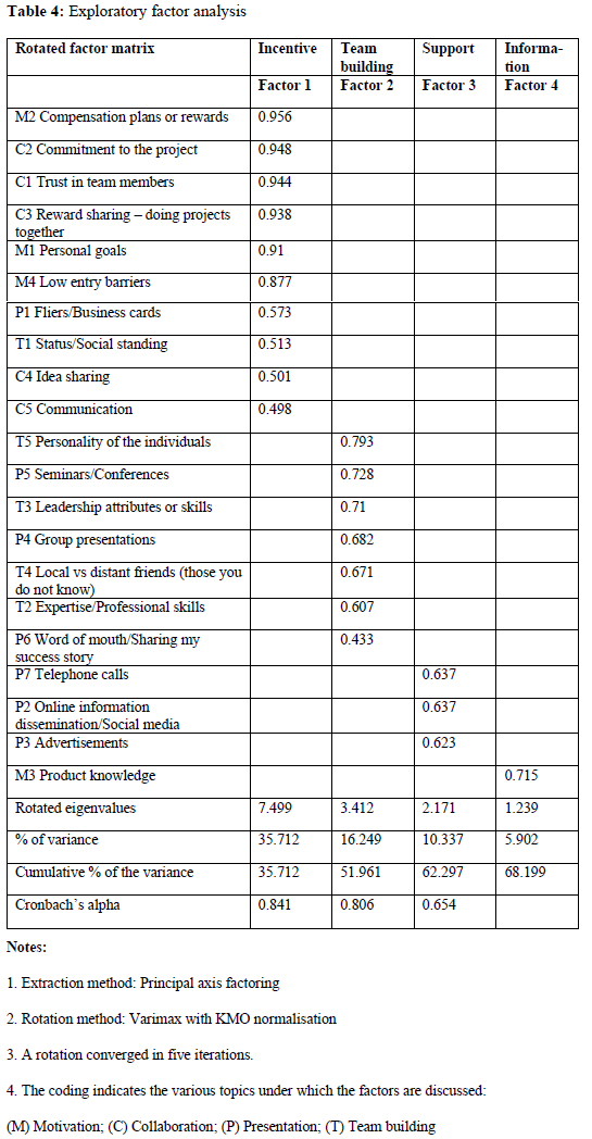 The study findings showed that the EFA used to extract those motivational factors that could be considered highly effective has shown that incentives rank highly on the final constructs. The respondents were asked to rate the use of various factors and the following factors were portrayed as being effective in motivating individuals to join MLM companies: compensation plan/reward; commitment to the project; trust in team members; reward sharing-doing projects together; personal goals; low entry barriers; flyers and business cards; status/social standing; idea sharing; and communication MLM team-building methods or strategies also contribute towards the process of motivating MLM participants through factors, such as: personality of the individuals; seminars/conferences; leadership attributes of skills; group presentations; local vs distant friends (those you do not know); expertise/professional skills; and word of mouth/sharing my success story. These intrinsic factors also require management attention to address specific objectives such as affiliation, personal development, and profitability.