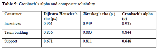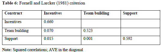 Convergent validity was also established when the average variance extracted (AVE) was > 0.5 and the AVE values for incentives, team building and support were 0.660, 0523 and 0.592, respectively (see Table 6).