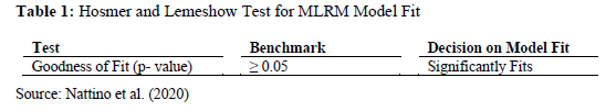 Based on the research approach, which was quantitative, and the nature of the dependent variable, which was categorical with more than two options, the study used the multinomial logistic regression model (MLRM) in its data analysis. The prevalent condition that needs to be satisfied for interpreting the odds ratios in MLRM is the specification of reference category as a control group among different levels of outcome variables (Fagerland and Hosmer, 2017). The study expounded further on the three different models employed for reference category selection: (1) proportional odds, where the probabilities of equal or less value of levels are compared with such of higher value (2) adjacent-category model, where the probabilities of values of a certain level are compared with such of the next adjacent level and (3) constrained continuation model where the probabilities of values of a certain level are compared with values of all other levels with higher values. Considering the dominance of the "never adopted" level in frequency (90%) and the values of other levels in disposition, this study opted for the constrained continuation model. In this regard, the odds of treated levels 2, 3, 4 and 5 were assessed against the odds of controlled level 1 adoption.