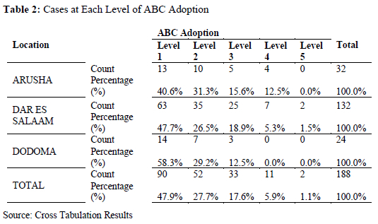 The descriptive statistics, as summarised in Table 2 below, show the cases at each level of ABC adoption in all three research areas. Dar es Salaam had the largest total number of companies with ABC adoption at least at each level, while Dodoma had the lowest number of adopters.