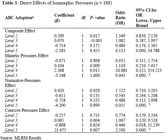 At this level, the costs of manufactured products are determined for business decisions by the management. The inferential statistics confirmed the effect of coercive pressures (p= 0.007, ß= 21.675) only as the driver to adopt the highest level of ABC implementation. The odds of contribution by coercive pressures were greater by 159% than the odds of contribution to level 1 of ABC adoption while holding other levels (2,3,4) constant. In an actual sense, the responses to regulatory authorities, customers, suppliers and competitors played great roles in explaining the companies' reach to level 5 of ABC adoption, which is the highest of all. The results are consistent with the findings by D'Andreamatteo et al. (2019) and Anafinova (2020) that coercive pressures played a significant role in innovation adoption in general. On the other hand, the effects of mimetic pressures (p= 1.000, ß= -3.148) and normative pressures (p= 0.999, ß= -4.200) were statistically insignificant as their p-values were greater than 0.05. The cumulative effects of both mimetic and normative pressures diluted the effect of coercive pressures to have the composite effect (p= 0.455, ß= -2.183) by all three forces insignificant.