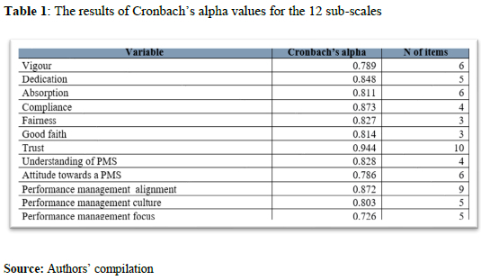 Cronbach's alpha was performed to test the reliability of the measuring instrument. The results of Cronbach's alpha values for the 12 sub-scales of the PMS, employment relationships and work engagement are illustrated in table 1.