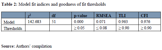 Based on table 2 above, the chi-square value (χ2 = 142.683) was significant at p < 0.001. While this was not in line with the threshold, χ2 can be considered a sensitive measure of model fit that is affected by factors such as sample size (Hooper, Coughlan, and Mullen 2008, 54). The root mean squared error of the approximation value fell within the good-fit range. Additionally, both the Tucker-Lewis index (0.963) and comparative fit index (0.976) values were well within the threshold for strong model fit. Overall, the model demonstrated a convincingly acceptable fit to the observed data.