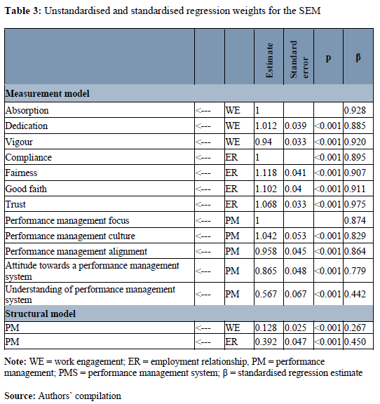 Based on table 3, the results of the analysis show that there was a statistically significant relationship between work engagement and the PMS (ß = 0.267, p<0.001), as per objective 2. An important observation from SEM is that there was a strongly significant relationship between employment relationships and the PMS (ß = 0.450, p<0.001) as per objective 2. More importantly, an examination of the structural model results revealed that employment relationships had a larger impact on the PMS than work engagement. According to the structural model output in table 3, there was a correlation coefficient of 0.41 between work engagement and employment relationships. Based on the results, it can be concluded that there was a strong relationship between PMS, employment relationships and work engagement (see figure 1).