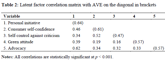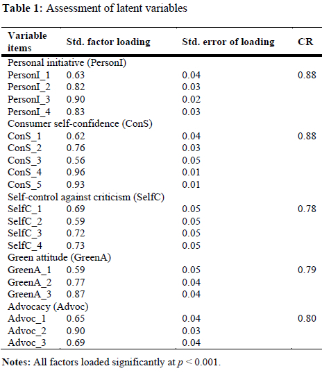 The statistical analysis commenced with confirmatory factor analysis and assessment of the measurement model that included all five constructs under investigation, namely green attitude, consumer self-confidence, self-control against criticism, advocacy, and personal initiative. After accounting for covariance between the second and third items of the scale that measured self-control against criticism, acceptable fit statistics were obtained: (Hair et al. 2019): χ2(141) = 330.62; (χ2/df = 2.34); comparative fit index (CFI) = 0.93; Tucker-Lewis index (TLI) = 0.91; and root mean square error of approximation (RMSEA) = 0.072.