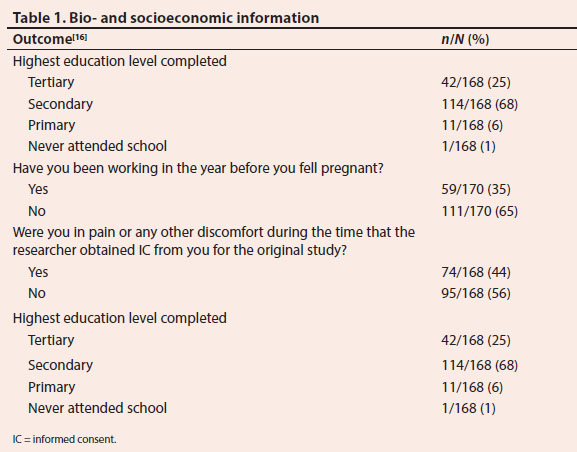 Bio- and socioeconomic information demonstrated that the study participants' mean age was 25.9 (standard deviation 5.98) years, and the range between 17 and 42 years. Slightly more than two-thirds (68%) had completed secondary education, and similarly, 65% reported that they had not been employed before they fell pregnant. Due to the nature of the original trials, one could have expected that 44% reported being in pain or discomfort when IC was obtained (Table 1).[16]