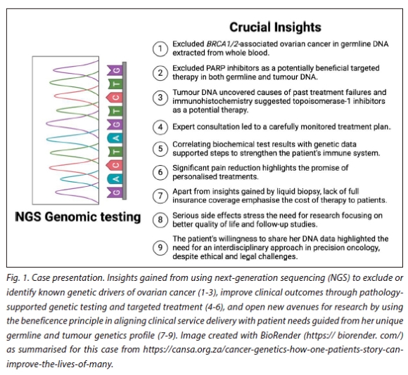 Acknowledgements. This article is dedicated to the patient with colorectal cancer featured for the first time in this article, who died on the 22nd of March 2024, six months after receiving the results of two tumour-NGS tests performed for the same purpose. We thank Dr Dionne van Reenen of the University of the Free State for family support as well as all cancer patients and treating clinicians for sharing their experiences and relevant data to enable the preparation of this manuscript. Our gratitude goes to Dr Nicole van der Merwe for genetic counselling as part of the Open Genome Project, which supported the Master's and Doctoral degrees awarded to Mr Lwando Mampunye and Dr Abisola Okunola in 2020. We thank Drs Chantelle Scott, Daniel Olivier and Elouise Kroon of Stellenbosch University for reflecting on the outcome of actions taken within an evolving laboratory workflow currently applied in COVID-19 host genomics research. The figures included in this manuscript were constructed using BioRender and stock MS Word images, while parts of the text were shortened and rephrased with the assistance of the ChatGPT language model.