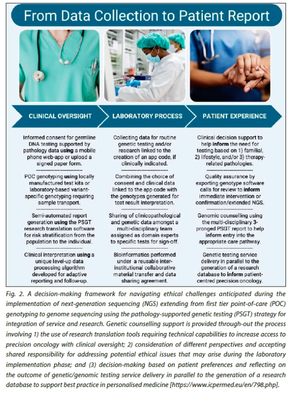 Efficient collaboration between healthcare practitioners and laboratory scientists is imperative to enhance clinical access in the realm of precision oncology, notwithstanding the numerous challenges that may arise during its implementation. Fig. 2 shows the proposed NGS workflow for PM-ISR, from obtaining informed consent for first tier genotyping elevated to multi-gene panel testing and whole exome/genome sequencing in uninformative cases. Challenges encountered during the integration of research and service delivery are addressed by appropriate test selection aided by genetic counselling to facilitate clinical decision-support, elevation to extended genetic testing in uninformative cases and clinical implementation of risk reduction strategies tailored to the needs of the individual.[15] An umbrella informed consent document, refined over more than a decade, is completed together with a structured report-generating questionnaire to help clarify the benefits and limitations of PSGT as a novel approach to integrating clinical service delivery with translational genomic research. Moving from paper-based to electronic informed consent for genetic testing of NCDs was justified by the emergence of the coronavirus disease in 2019,[50] to enable a phased research translation process encouraging freedom to consent or decline testing without coercion. Understanding the risks of participation in translational research that may incorporate aspects of infectious diseases' host genetics, thus represents the first step in collecting personal information for the generation of adaptable feedback reports in the form of a case presentation for each patient, reflecting the collective knowledge of the researchers and healthcare practitioners involved in the research translation process. This is the purpose of the PSGT strategy: shifting the focus from volume of services to quality of care that prioritises early interventions and enhancement of individual patient experiences.[51-53]