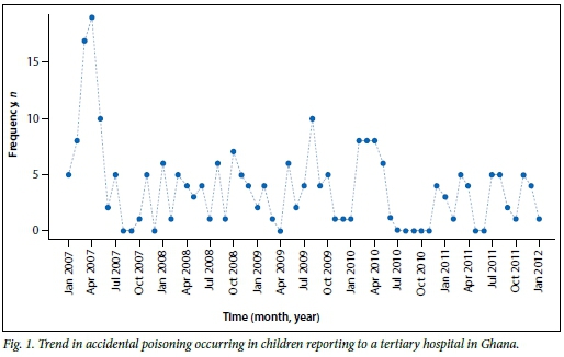 A total of 253 cases of home poisoning had reported in person to the emergency unit of the hospital. (The data gathered did not include telephone enquiries but only cases that had reported to the emergency department for treatment.) On average, about four cases of home poisoning were reported to the Paediatric Emergency Unit of the Komfo Anokye Teaching Hospital every month over the study period of 61 months (Fig. 1).