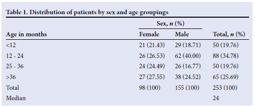 The median age of children affected by poisoning was 24 months (interquartile range 24 - 48 months). There were more males (n=155, 61.3%) than females (n=98, 38.7%) reported with poisoning, giving a male to female ratio of 1.58: 1 (Table 1).
