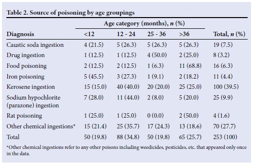 RESULTS: Poisoning is a significant health problem in the study area. A total of 253 children reported to the hospital with poisoning over the 61-month period, with an average of four cases per month. The male to female ratio was 1.58:1. The median age of the children was 24 months (interquartile range 24 - 48 months). Kerosene was the leading cause of poisoning (39.5%).