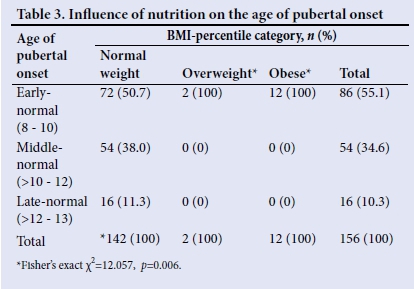 A total of144 (91.1%), 2 (1.3%) and 12 (7.6%) of the subjects in Tanner B2 were normal weight, overweight and obese, respectively. None was underweight. All the subjects in Tanner B2 were between 8 and 13 years old. To determine the relationship between nutritional status and age at onset of puberty, this age range was further categorised as shown in Table 3, which indicates the influence of nutritional status on the age of pubertal onset. Eighty-six (55.1%) of girls in Tanner breast stage 2 (B2) were between 8 and 10 years old (early-normal pubertal onset), 54 (34.6%) were >10 - 12 years (middle-normal pubertal onset) and 16 (10.3%) were >12 - 13 years (late-normal pubertal onset). A little above half (51.7%) of the girls with normal weight had early-normal pubertal onset. All the girls who were overweight or obese had early-normal pubertal onset, even though overweight and obese girls in B2 constituted the minority of the sample. A statistically significant association was observed between overnutrition (overweight and obesity) and early-normal age of pubertal onset (Fisher's exact χ2 (FE χ2) = 12.057, p=0.006). Logistic regression analysis showed that girls who were overweight or obese were only 1.259 times more likely to have early-normal pubertal onset compared with those of normal weight (odds ratio (OR) 1.259, p=0.001).