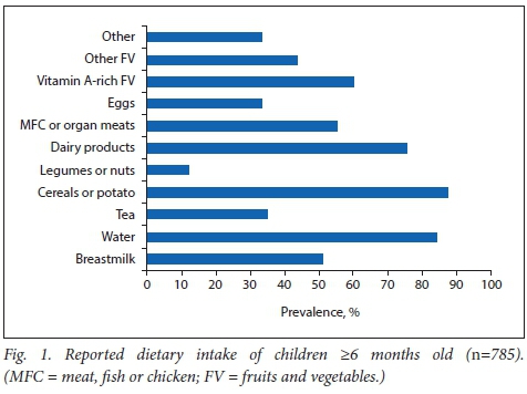 The dietary intake of children (>6 months old) over the previous 24-hour period is shown in Fig. 1. Cereals or potato (87.5%; n=687/785), water (84.3%; n=662/785) and tea (35%; n=275/785) were the most commonly consumed sources of solid foods and fluids, followed by dairy (75.4%; n=592/785), vitamin A-rich fruit and vegetables (60.3%; n=473/785) and meat, chicken, fish or organ meats (55.2%; n=433/785).
