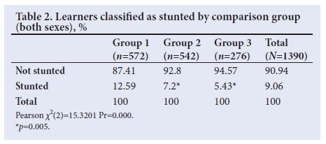 The results presented above demonstrate that both programmes contributed positively to children's anthropometric outcomes. The children receiving only the NSNP had stunting levels of 12.59%, a rate similar to the national rate of 15.4% (for children aged 2 - 14 years),[9] which is to be expected given that over 63% of children in SA live in the poorest 40% of households,[17] and therefore receive the NSNP Children at the relatively poorer schools that were receiving two meals (group 1) had lower stunting levels than group 2 learners. The findings pertaining to the lower levels of stunting among learners receiving two meals are surprising. The research literature demonstrates that stunting is very resistant to change, particularly as children age.[18] Ideally, undernutrition effects need to be dealt with in early childhood, to avoid stunting. However, more recent literature has raised debate about the resistance of stunting to change. Prentice ef al.[19] suggest that children can catch up from stunting later on in life, although it seems that cognitive delays are particularly resistant to change.[20] The data presented here may mean that the combined effects of a breakfast and a lunch meal can shift stunting levels, corroborating a previous study conducted in an urban area on the combined effects of breakfast and lunch, where stunting was reduced by almost 5 percentage points over a 10-month period.[21]