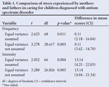 The main objective of the study was to explore the differences in parental stress experienced by mothers and fathers raising children with ASD. Results show that the experiences of the two groups are significantly different. The findings are consistent with those from studies in other countries where parents, and particularly mothers, were found to exhibit elevated parental stress levels, agitation and other physical problems.[43,44] Mothers reported higher scores on both the intensity and frequency scales compared with fathers. These findings may be due to several factors relating to the roles society ascribes to mothers and fathers. Society places different expectations on individuals based on their gender and their value systems and beliefs. These differ from one society to the other.[45] Traditionally, gender roles suggest that women should behave in ways that are feminine, nurturing and family oriented, whereas men should be providers and leaders.[45] However, family dynamics have evolved, and more mothers are now in formal employment. Despite the changing environment, research shows that mothers are still highly active in their traditionally assigned maternal and domestic roles, although some literature does suggest fathers being involved in childcare activities.[46] Regardless of the notable increase in involvement by fathers in their children's lives, mothers still provide in more than half of the care needs and interact more with the child than the working father.[47-50] Pressure stemming from working and caring for children may affect women more than men, and may be exacerbated when caring for a child with a neurodevelopmental condition such as ASD. Tasks associated with caring for a child with ASD exceed the usual type of responsibilities. For example, mothers tend to be the ones who attend to the demands of a child with ASD, rather than fathers.[50]