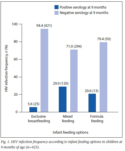 Infant feeding records (n=923) showed that the majority of mothers opted for exclusive breastfeeding rather than formula or mixed feeding (Fig. 1). The HIV infection rate was 5.6% for children who were exclusively breastfed, followed by a prevalence of 20.6% and 29% among formula-fed infants and those who received mixed feeding, respectively.