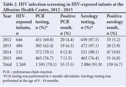 In 2011, Mozambique adopted the Global Plan for Elimination of MTCT of HIV and set its target to reduce MTCT to less than 5% by the year 2015;]1] the target date was subsequently extended to 2017.]1] The programme also envisaged 90% ART coverage to HIV-seropositive pregnant women.]1] Monitoring ART coverage and HIV infection rates in HIV-exposed children can identify trends and assist in providing valuable information that would enable programme managers to prioritise actions. The aim of the present study was to describe HIV infection rates in HIV-exposed infants participating in a PMTCT programme at the Albazine Health Centre (AHC) in Maputo, Mozambique.