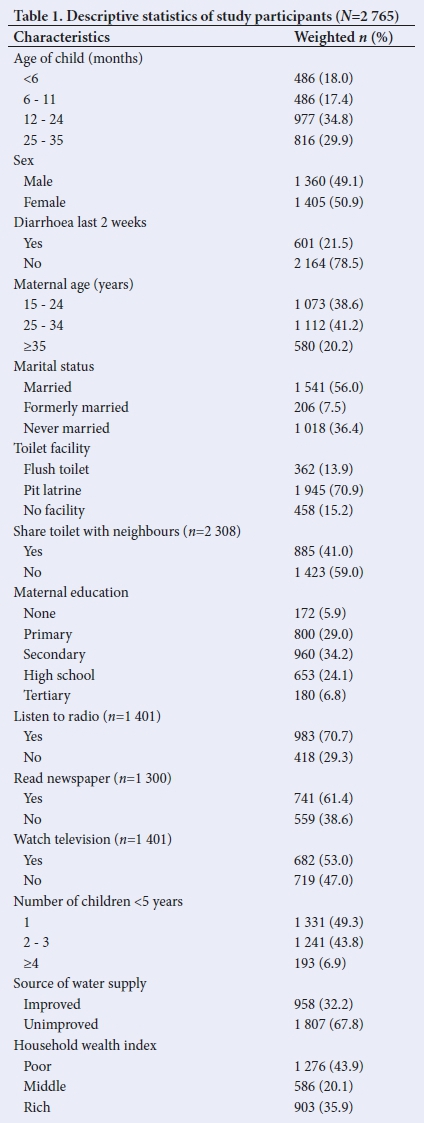 Of the total children included in the analysis, about half (50.9%) were female and 21.5% had had diarrhoea in the previous two weeks before the survey. A majority (41.2%) of the children were born to mothers aged 25 - 34, married (56%), with secondary education (34.2%). About seven out of 10 were from households that used a pit latrine, and a majority (67.8%) from households that used unimproved water sources and were from rural areas (75.3%) and residents in the Manzini region (35.6%) (Table 1).