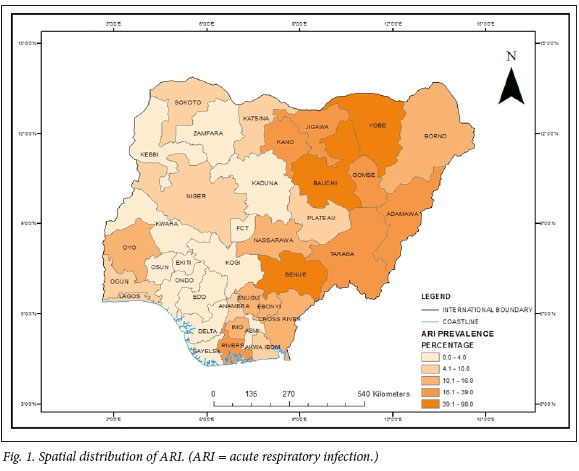 Acute respiratory infection (ARI) is a disease of the respiratory system caused by viruses, fungi and bacteria, some of which include Strepotococcus pneumoniae, Haemophilus influenzae, Pneumocystis jirovecii and respiratory syncytial virus.[1] Though preventable and treatable, this disease is the single largest infectious cause of death in children; it accounts for 16 percent of deaths among children under the age of five (U5C). In 2015, for example, 920 136 children died as a result of ARI.M Numerous risk factors for ARI have been indicated in the literature, which include partial/incomplete immunisation, biomass fuel use, indoor and outdoor air pollution, parental illiteracy, inadequate ventilation, cigarette/tobacco smoking, low family income and overcrowding.[2-5] However, most of the existing studies did not consider the importance of spatial analysis and its robust capabilities in revealing patterns and predictors of diseases.[6]