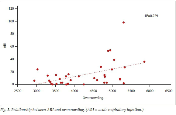 As shown in Fig. 2, ARI hotspots were detected only in the northeastern region of the country - specifically Yobe, Bauchi, Gombe, Jigawa, Kano and Taraba (Fig. 2, Table 2). Interestingly, these six states are contiguous. The regression result found overcrowding to be the only significant factor (B=0.479; R2 =0.229; F=3.225; p<0.05), which implies that the overcrowding index contributes 22.9% of the variation in ARI prevalence in the country. Furthermore, it is noticeable that there is a positive relationship between overcrowding and ARI prevalence (Fig. 3). This means that as overcrowding increases, the prevalence of ARI will also increase.