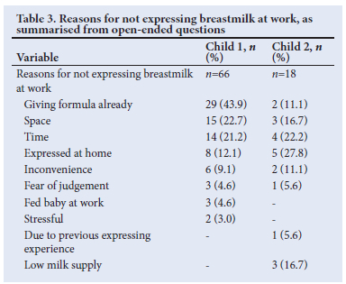 Of the mothers who wanted to express breastmilk at work, 67.7% intended to express for Child 1, but only 32.0% eventually did. Of the 57.7% of mothers who intended to express breastmilk for Child 2, 28.0% did. Reasons for not expressing breastmilk at work are shown in Table 3.