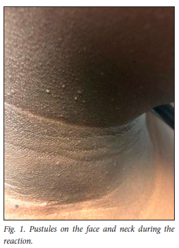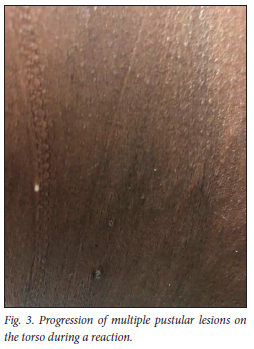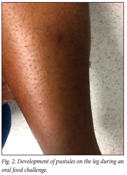 The patient was admitted for a graded OFC with increasing doses of cow's milk administered every 15 minutes. Thirty minutes into the challenge, the patient reported a sensation of itchy skin, followed by the development of multiple pustules on her face, neck (Fig. 1), arms (Fig. 2) legs and torso (Fig. 3). Her vital signs remained stable throughout the challenge which ended with a final dose of 100 mL and a total of 160 mL. After ingestion of the final dose, the patient reported abdominal pain without associated nausea, vomiting or diarrhoea. Oral antihistamine (10 mg cetirizine) was administered and she was observed for 2 hours after the challenge. The abdominal pain resolved within the observation period. A pus swab collected from skin pustules during the OFC cultured Staphyloccocus aureus. The pustules resolved within 8 days and the patient discontinued oral histamine use. No other medication was administered during the allergic reaction. CMA was confirmed and the patient was advised to continue with cow's milk protein elimination. Management included nutritional counselling and adequate calcium supplementation.