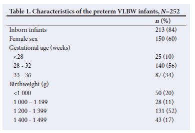 Two hundred and fifty-two preterm VLBW infants were admitted to the NCU during the study period. Of these, 84% were inborn and 16% were outborn infants. Three-quarters (76%) of outborn babies were from district hospitals, 15% born on arrival and 9% from regional and primary healthcare centres. The mean (SD) gestational age was 31.1(2.5) weeks, while the mean birthweight was 1 180.5 (206.7) g. The mean (SD) age of the mother was 26.4 (6.6) years. Table 1 shows a detailed description of the demographic profile of the study participants.