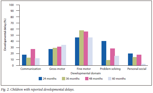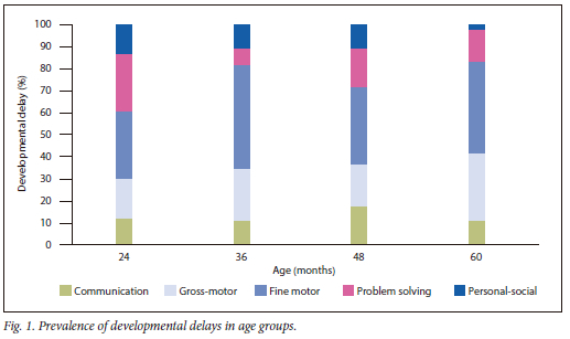 RESULTS: Findings showed that 64% of children had delays in at least one domain and 37% had multiple delays. More than half of the children had developmental delays in fine motor skills (51%), while gross-motor and problem-solving delays were reported for 30% and 26% of children, respectively. Communication and personal-social domain delays were observed in 17% and 14% of children, respectively