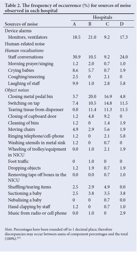 A pilot study was conducted at a tertiary public sector hospital in eThekwini that was not included in the main study. The pilot study was conducted to assess the functioning of the SLM in the NICU, as well as the feasibility of the methods used, including the duration of the measurements and observation of the sources of noise. The main study occurred at four public hospitals where the researcher conducted site surveys (Table 1) and developed floor plans for each NICU. The SLM and microphone were calibrated according to the manufacturer's specifications on each day. The SLM was positioned using the central site procedure and SANS 10083:2013 to determine the overall noise that neonates were exposed to in each NICU.[12,17,19-21] Noise measurements were conducted continuously for 48 hours on 2 consecutive days of the week. A Sunday and Monday were purposively selected to represent a weekend and a weekday, as research has identified significant differences in noise levels between them.[16,22,23] Noise measurements were recorded on a noise measurement form, categorised as morning (7h00 - 13h00), afternoon (13h00 - 19h00) and night (19h00 - 7h00) periods. A sample of the sources of noise and their frequency of occurrence were observed during the morning and recorded in a field diary and a sources-of-noise checklist (Table 2). The checklist was categorised according to device alarms and human-related sources, adapted from other studies.[13,18]