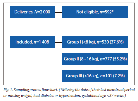 Our study aimed to define healthy weight gain in pregnancy. Based on Cedegren's findings,[3] we classified pregnancy weight gain into three groups: group I gained <8 kg; group II gained 8 - 16 kg; and group III gained >16 kg. Body mass index (BMI) in kg/m2 was used to assess and classify maternal corpulence according to the recommendations of the World Health Organization (WHO).[2]