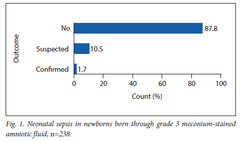 METHODS. A retrospective chart review was conducted at King Edward VIII Hospital (KEH) in Durban, KwaZulu-Natal (KZN), South Africa (SA) from 1 January to 31 December 2018. Data were collected from 238 newborns born through grade 3 MSAF to determine the incidence of neonatal sepsis, respiratory complications and neurological complications associated with grade 3 MSAF exposure. Descriptive statistics were used.