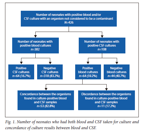 This was a retrospective analytical study conducted at Chris Hani Baragwanath Academic Hospital (CHBAH), Johannesburg, South Africa. The study population comprised neonates with suspected sepsis admitted to the neonatal unit at CHBAH who underwent LP between 1 January 2017 and 31 December 2017, and had positive blood and/or CSF cultures. The inclusion criteria were all neonates who had both CSF and BC results recorded in the National Health Laboratory Services (NHLS) database. Among positive cultures, Corynebacterium spp, Bacillus spp and coagulase-negative Staphylococcus were considered contaminants, thus, those with positive cultures for these bacteria were excluded from the analysis. Only cultures from neonates who were aged <30 days were included.