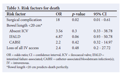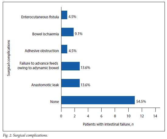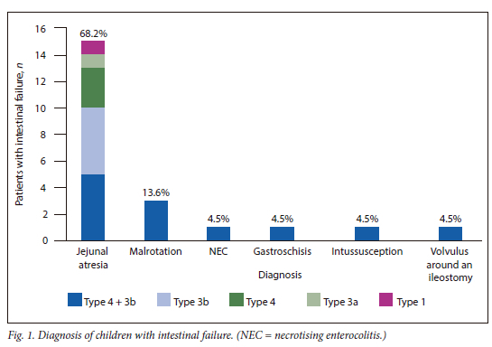 RESULTS. A total of 22 patients with intestinal failure were managed during the study period. The diagnoses included: type 4 jejunal atresia with 3b component (n=5; 22.7%); type 3b jejunal atresia (n=5; 22.7%); type 4 jejunal atresia without 3b component (n=3; 13.6%) and malrotation with volvulus (n=3; 13.6%). One patient each had necrotising enterocolits, gastroschisis with atresia, intussusception, type 1, jejunal atresia with volvulus, type 3a jejunal atresia and volvulus around an ileostomy. The median bowel length was 36.5 cm and average length of stay was 122 days. Enteral autonomy was achieved in 10 patients (45%) and survival in 9 patients (41%). Surgical complication requiring early re-operation (odds ratio 18) and bowel length <20 cm were associated with non-survival.
