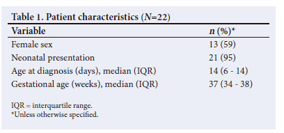 Fifteen patients (68%) developed IFALD. No patients progressed to end-stage liver disease; to minimise this complication, enteral feeds were initiated early where feasible. Patients who developed IFALD were managed by advancement of enteral feeds if possible and cyclical administration of PN. During the study period, the majority of patients received only 100% soybean-based PN (Intralipid; Fresenius Kabi, Germany). Soybean, medium-chain triglygeride, olive oil and fish oil-based PN (SMOFlipid; Fresenius Kabi, Germany) was only available towards the end of the study. SMOFlipid was only received by 1 patient - he did not develop IFALD.