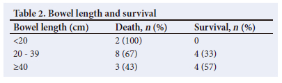 Bowel length <20 cm predicted death perfectly. Bowel length >20 cm was not a good predictor of death or survival.