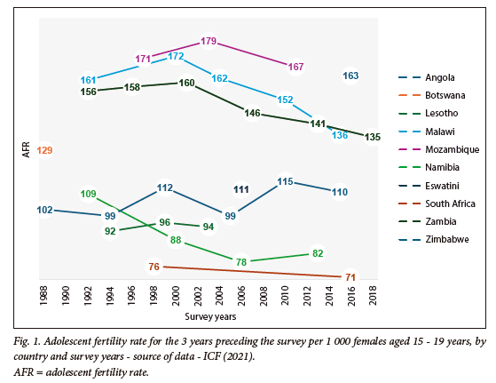 Despite undergoing an advanced fertility transition overall,[3] adolescent fertility remains an issue in the subregion (Fig. 1).[24] The subregion also faces a disproportionate adolescent HIV epidemic that predominantly affects the female subpopulation. This mirrors the broader HIV burden within the subregion and holds a direct link to adolescent fertility, given the heterosexual nature of HIV transmission.[25] This HIV epidemic has also adversely impacted households,[3] exacerbating the already prevalent issues of orphanhood and parental absence. These challenges stem from long-standing labour migration patterns, which in turn contribute to the prevailing marriage, childbearing and child-rearing practices.[26] Additionally, factors such as armed conflicts,[14] the more recent impact of the COVID-19 epidemic[16] and orphanhood resulting from cancer-related mortality[13] all play a role in shaping the landscape of orphanhood within the subregion. This underscores the importance of research on adolescent fertility.