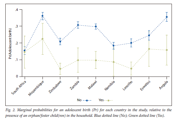 RESULTS. The relationship between orphanhood, parental absence and rates of adolescent childbearing varied across countries. Parent absence was associated with a higher likelihood of childbearing (adjusted odds ratio (aOR) 3.07, p<0.05). Conversely, having an orphaned child(ren) in the household was associated with a 36% lower likelihood of childbearing, though not statistically significant. Compared with South Africa (SA), all the countries in the study showed significantly higher odds of adolescent childbearing (aOR 1.4 - 5.4, p<0.05). The probability of adolescents giving birth was generally lower when residing with orphaned children in the household, with Angola, Malawi and Zambia showing the highest differences, and SA the smallest.