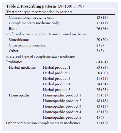 Most participants (n=76; 76%) reported recommending both complementary and conventional treatment options for IC. Regarding CMs, products containing simethicone were most favoured, but were only recommended by 20% of the sample. CMs most recommended by participants included probiotics (n=64; 64%) and this was followed by various herbal (five products) and homeopathic medicines (five products) (Table 2).