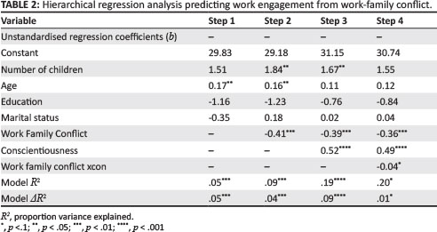 Two moderated hierarchical regressions were performed. The first regression analysis was aimed at determining whether conscientiousness moderates the relationship between work-family conflict and work engagement. The second regression analysis was aimed at determining the interaction effects of neuroticism on the relationship between work-family conflict and work engagement. As mentioned, categorical control variables (marital status and educational status) were collapsed into two categories in each case.