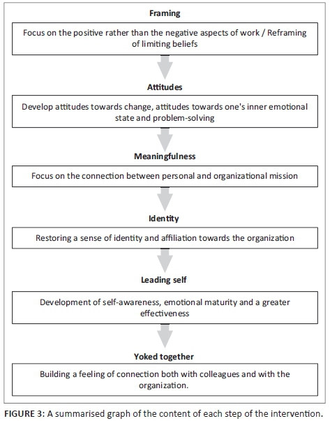 Intervention content: As mentioned earlier, work engagement is a construct originating from positive psychology principles (Meyers et al., 2013) and is characterised as a positive, fulfilling, work-related state of mind (Schaufeli & Bakker, 2003). Based on current evidence, personal resources of employees, such as psychological capital, play a central role in the development of work engagement. For instance, Xanthopoulou et al. (2007) found that an increase in the psychological capital of employees is consistent with an increase in their work engagement. Therefore, in order to enhance work engagement, we developed an intervention programme directed at improving four indicators of psychological capital (hope, optimism, self-efficacy and resiliency). We were inspired by the COR theory (Hobfoll, 1989) to develop the content of this intervention. Based on this theory, according to which individuals with more personal resources are more likely to overcome challenges and experience more positive outcomes at work, an intervention programme focused on a number of positive reappraisals of the work role was developed. It consists of six steps that were expected to lead to improvements in psychological capital and work engagement (Figure 3). The total duration of the intervention was one week and there were three day-long sessions in which the intervention content was presented according to the following steps: