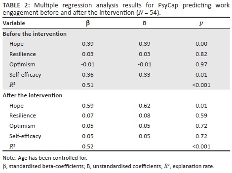 Hypothesis 1 stated that the dimensions constituting psychological capital are positively related to work engagement at both T0 and T1. Before the intervention, results from multiple regression analyses (see Table 2) revealed a significant positive beta coefficient only for the dimensions of hope (β = 0.39, p < 0.01) and self-efficacy (β = 0.36, p < 0.01) predicting the overall index of work engagement. After the intervention, only the dimension of hope was found to be a significant predictor of the overall index of work engagement (β = 0.59, p < 0.01), hence providing partial support for H1.