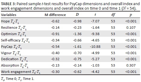 In order to test H2, which stated that the participants' levels of psychological capital will be significantly increased after the training (T1), as opposed to their level prior to training (T0), a paired-sampled t-test was used. This tested the significance of the difference between the measures at T0 and at T1. The same method was used to test H3, which stated that work engagement would have improved after training. As can be seen in Table 3, a significant mean difference on all variables except one (i.e. absorption) was found between T0 and T1 (p < 0.001). Regarding psychological capital, the most noticeable change occurred with optimism, having the largest mean difference among the dimensions considered (−0.91) and effect size (−1.36). Regarding work engagement, results reveal that vigour showed the largest mean difference (−0.40), dedication reported the largest effect size (−0.75), while the mean difference referred to the dimension of absorption was not statistically significant. These results confirmed H2 and partially confirmed H3.