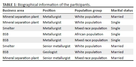 A non-probability and purposive small sample of eight women participated in the study. Small samples are suitable for exploring lived experiences regarding a specific social phenomenon through in-depth interviews (Creswell, 2003). However, theoretical saturation in the study occurred with the eighth interview. Theoretical saturation occurred because the data from the interviews became repetitive (Groenewald, 2004). Only individuals who satisfied the following criteria relevant to the research objectives participated in the study (Guest, Bunce, & Johnson, 2006): they had to be women who occupied core mining positions, possessed a formal post-grade 12 qualification (a bachelor's or BTech degree), a minimum of 3 years' experience in the mining environment and had to be in specialist or supervisory roles. The organisation had 1728 permanent employees throughout South Africa, with women comprising 14.5% of the total workforce, with the majority of them occupying non-core administrative positions. Table 1 shows the biographical information of the participants.
