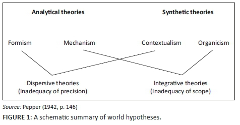 Pepper (1942) suggested that scientists, researchers and scholars employ these root metaphors as cognitive pathways to structure their endeavours aimed at the refinement of knowledge. According to Ackerman et al. (2010) and Lakoff and Johnson (1999), such an undertaking seldom unfolds on a conscious level. Root metaphor theory suggests that world hypotheses, views or theories are autonomous and, as such, mutually exclusive, suggesting 'a mixture of them … can only be confusing' (Pepper, 1942, p. 104).