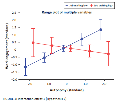 The second objective of the study was to investigate the role of job crafting as a critical personal resource on the engagement of special needs teachers. The results of the analysis indicate that job crafting has a positive moderating effect on the relationship between autonomy and employee engagement. Figure 1 proposes that the activities that characterise employee work autonomy are in essence adequate to positively influence work engagement without a greater use of job crafting. It could be argued that when a special needs teacher is vested with work autonomy, there is freedom and discretion in scheduling and performing tasks at work (Cummings & Worley, 2008). As a result, the special needs teacher with work autonomy has the freedom and control over what needs to be done and will possibly still become engaged in his or her work role, without job crafting.